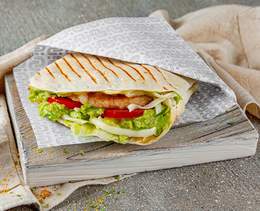 Lavaș, file de pui pane, varză chinezească, avocado, castraveți, cașcaval Buko, susan, sos Grecesc - 350g #kebab
