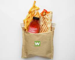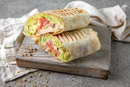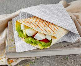 Lavaș, piept de pui la grătar, salată iceberg, castraveți, roșii, cașcaval Cheddar, cașcaval Dorblu, cașcaval Mozzarella, sos de iaurt cu usturoi, cașcaval Parmesan, sos de iaurt cu muștar - 340 gr