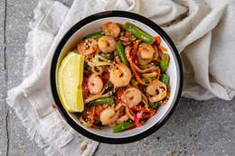 Orez sau tăiței, ceapă, morcovi, ardei dulce, fasole verde, ciuperci, brocoli, sos de soia, ghimbir, susan - 300g