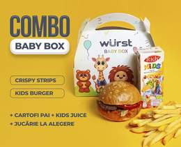 Kids burger sau Crispy Strips, French fries, Kids Juice, jucărie la alegere