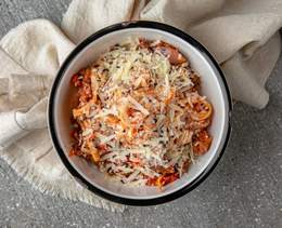 Tăieței udon din făină de grâu, pârjoală de vită, ciuperci, ardei dulce, ceapă roșie, parmezan, sos de roșii, sos de soia, semințe de susan - 270 g