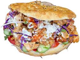 Pitta, carne de pui, varză, roșii, castraveți proaspeți, ceapă marinată, sos alb, sos roșu, 450gr