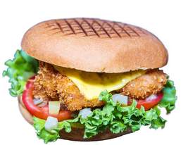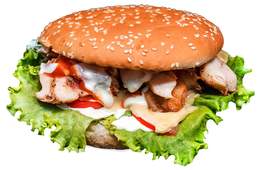Chiflă cu susan, carne de pui, cașcaval, frunză de salată, roșii, castraveți murați, ceapă roșie, sos alb, sos roșu, 295gr