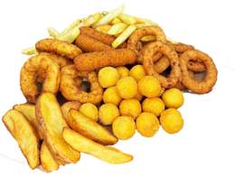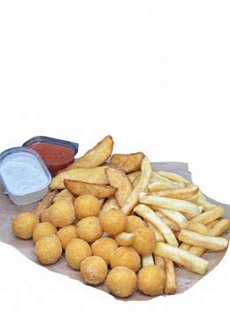 Cartofi pai, cartofi wedges, bile de cartofi, mozzarella sticks, inele de ceapă, inele de calamar, sos alb, sos roșu, 500gr