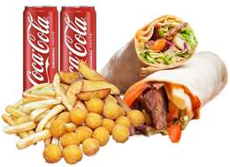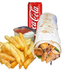 Shaorma de pui 380gr, cartofi pai, sos alb, sos roșu, coca-cola 330ml