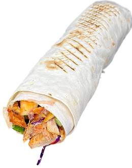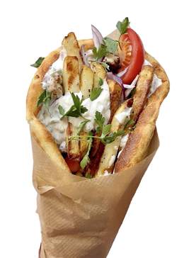 Lavaș, carne de pui, cartofi pai, varză, roșii, castraveți murați, ceapă marinată, morcov coreean, sos alb, sos roșu, 700gr