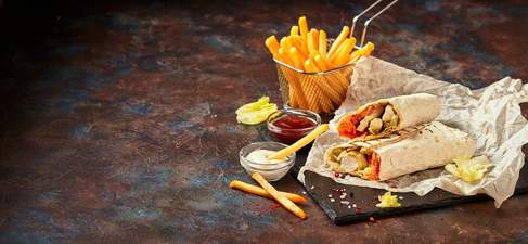 Lavaș, tocătură de vită, varză, cartofi pai, ceapă marinată, roșii, castraveți murați, morcov coreean, sos alb, sos roșu, 450gr