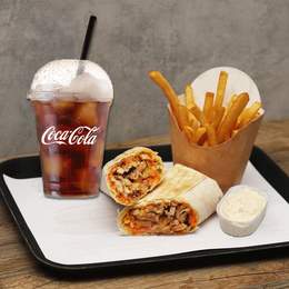 Combo WrapUn meniu complet: Carne de pui de pe doner, castraveți proaspeți, salată verde, ceapa, roșii și sos de usturoi învelite într-o lavas cald. alături de cartofi pai crocanți și o Cola rece. Perfect pentru prânz sau cină!