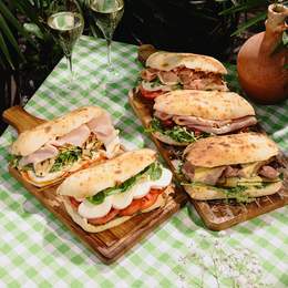Pâine Ciabatta, dovlecei marinați, ardei copt marinați, roșii proaspete, vânătă marinată, ulei de măsline, sos pesto din busuioc, cașcaval, Mozzarella, cașcaval Rossiski, pătrunjel frunze, oregano190 gr! – acest produs conține alergeni – gluten, lapte