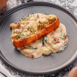 File de somon, frișcă, creveți, spanac, roșii uscate, cașcaval Grana Padano, gnocchi, vin alb, usturoi, unt, pesmeti, condimente, ulei de măsline, suc de lămâie130/300 gr! – acest produs conține alergeni – pește,crustacee,lapte,gluten