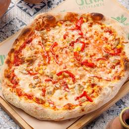 Făină de grâu, sos italian de roșii, file de pui, porumb conservat, ardei dulce, cașcaval Mozzarella, drojdie - 570 g! – acest produs conține alergeni – lapte, gluten