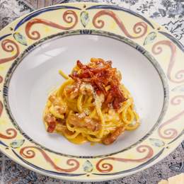 Făină din grâu dur, unt, ouă, usturoi, sos de roșii, guanciale copt, pastă de ardei iute, cașcaval Pecorino Romano - 305g