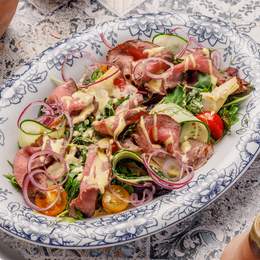 Salată mix, salată Rucola, roșii cherry, ceapă roșie, castraveți proaspeți, Roast Beef, sos Bearnaise. - 240gAcest produs conține alergeni: lapte