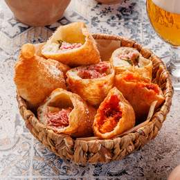 File pui marinat, făină de grâu, ulei de măsline, salvie, vinul casei alb, oregano, prosciutto Crudo, cașcaval, mozzarella, piure de cartofi, iraj. Acest produs conține alergeni: gluten, lapte 300/95 g