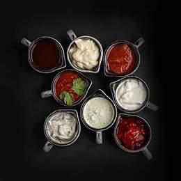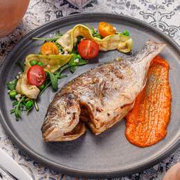 Pește Dorado, sare, piper negru, rucola, ardei copt, sos de hrean, ulei de mărar, lămâie260/85/50/20 g! – acest produs conține alergeni – pește, lapte