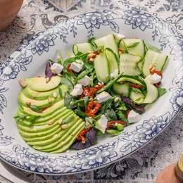 Salată mix,castraveți proaspeți,mazăre,avocado,ceapă verde,roșii uscate,cașcaval feta,fregola,dressing francez,nuci de pin220 gr! Conține alergeni - lapte,nuci