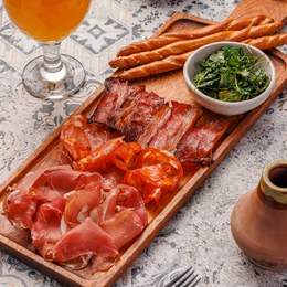 Ceafă de porc, piure de fasole, rucola, capere, roșii cherry, ulei de măsline extravirgin, cremă de oțet balsamic, cașcaval Grana Padano. Acest produs conține alergeni: lapte230/60/45 g