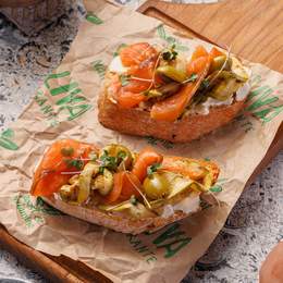 Pâine Ciabatta, cașcaval Buko, somon slab sărat, dovlecei marinați, olive, ulei de mărar, microplante200 gr! Conține alergeni - gluten,lapte,pește