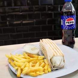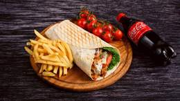 2 Lavaș,Frunza de salata, roșii, cartofi, varză,castravete proaspete, sos alb, cașcaval ras, carne crocanta, ketchup 460gx2; 2porții de cartofi pai cu sos usturoi/ketchup; Băutura la alegere 500mlx2.