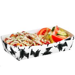 Carne de pui, cartofi pai (sau cartofi felii), sos de usturoi, ketchup, salată iceberg, roșii, castraveți proaspeți, ceapă roșie, sos vinaigrette, pătrunjel uscat - 450 g