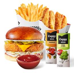 Nughete din piept de pui (sau burger Chick-Chick), cartofi pai, jucărie, suc pentru copii, ketchup