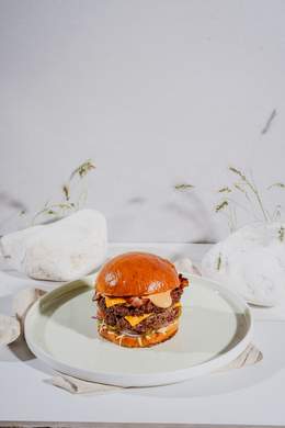 Chiflă, pârjoală dublă de vită, dublu cheddar, muștar american, iceberg, ceapă roșie, roșie, castraveți murați, sos crem-BBQ-420