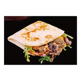 Pârjoală de vită Wagyu&Angus SUA, ciuperci champignon, pastă de tru e, cașcaval cheddar, tortilla, rucola, roșii, sos, ceapă caramelizată, piper negru măcinat, sare, ulei.260gr.