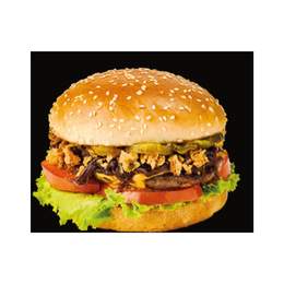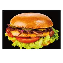 Burger de pui, panceta, cheddar, sos BBQ, castraveti marinati,ceapa, rosii,salata verde,chifla. Burger de pui superb GS, panadă, cașcaval Cheddar, chi ă p-u burger, salată Lollo verde, roșii, bacon de porc, castraveți marinați, sos, ceapă caramelizată, piper negru măcinat, sare, unt, ulei de floarea soarelui.300gr