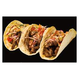 Fileu de pui marinat în sous-vide, tortilla p-u taco, roșii, sos Salsa Roha, castraveți, lămâie, ceapă roșie, ulei de floarea soarelui, pesto de coriandru. 300gr.