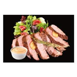 Steak: carne de vită Namibia Ribeye în sous-vide, rozmarin, usturoi, ulei de floarea soarelui, sare, piper negru măcinat. Salată: ardei Kapya, roșii cherry, castraveți, salată Misticanza, cașcaval, sos Vinegret, semințe de dovleac, sare, piper negru măcinat. Sos.200/200/50 g.