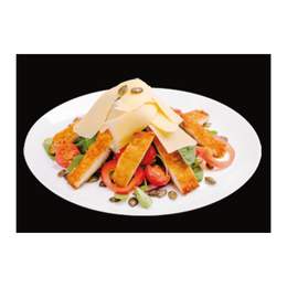 Snițel Vienez, ardei Kapya, roșii cherry, castraveți, salată Misticanza, cașcaval, sos Vinegret, semințe de dovleac, sare, piper negru măcinat.320gr.