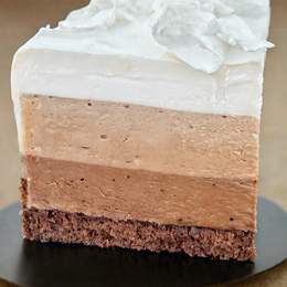Шоколадный бисквит. Мусс слоями из черного, молочного и белого шоколада.