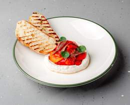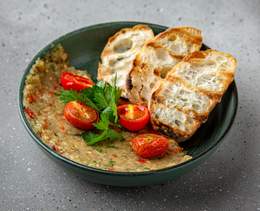 Un aperitiv din vinete precoapte și apoi tocate, roșii și ardei dulci decojiți, cu adaos de ceapă, usturoi și ierburi aromatice și asezonat cu ulei de măsline - 180/25g