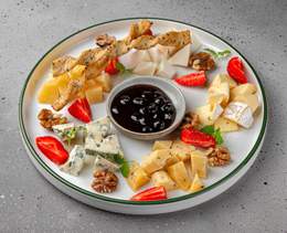 Platou cu 4 tipuri de brânză: Pecorino Tartufo, Dorblu, Parmegiano, Brie și Chevrette. Se servește cu fructe de pădure, nuci, grissini și dulceață de coacăze negre - 150/100 gr