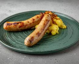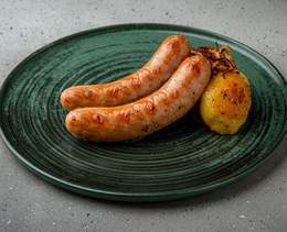 Cârnăciori cu bacon și condimente. Se servesc cu cartofi zdrobiți. Porția include 2 cârnăciori - 160/70 g