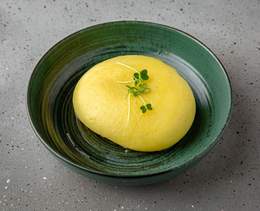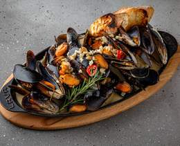 Pregătim midiile în bulion de pește și sos Blue cheese, pe bază de smântână de gătit și cașcaval cu mucegai albastru, cu adaos de usturoi, rozmarin proaspăt și cimbru. Se servesc cu baghetă proaspătă - 550/25g