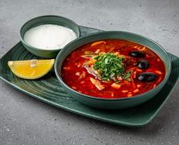 Supă consistentă și densă, pe bază de bulion de vită cu 4 tipuri de carne (coppa, șuncă, bacon, roast beef), cu adaos de castraveți murați, măsline și ierburi aromatice. Se servește cu smântână și lămâie - 350/50/40g