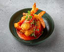Creveți tigru în făină condimentată și tempura pe bază de bere, prăjiți în ulei încins. Se servesc cu cremă Sweet Chilli și ceapă verde - 200g