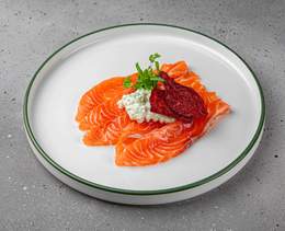 Somon afumat ușor preparat ca acasă cu tartar de castravete - 95/105 gr