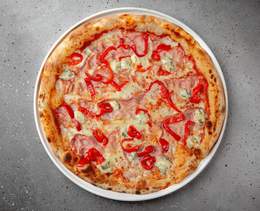 Pizza cu brânză Dorblu, bacon și ardei dulce. Sos de roșii - 520gr