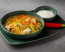 Supă ușoară de pui cu legume sotate și tăiței de casă.Se servește cu smântână și ardei iute - 300 g