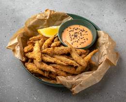 Hamsii de Marea Neagră prăjite în aluat cu bere, servite cu un sos picant de firmă - 200/50 g