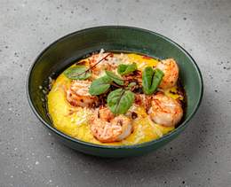 Creveți sotați în sos thailandez, serviți pe o cremă fină de porumb și pentru condimentarea felului de mâncare, se presară cu bacon crocant - 195 g