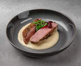 Piept de rață asezonat cu mix de piper, servit cu piure de fructe și cireșe - 280 gr