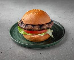 Pârjoală suculentă de vită, câteva felii de roșii proaspete, castraveți marinați și o frunză crocantă de salată într-o chiflă brioche - 230 g