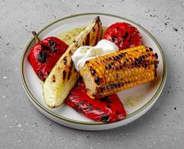 Legume la grătar, asezonate cu condimente, servite cu iaurt grecesc și ulei aromatizat - 250 gr