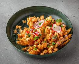 Conopidă în tempura cu parmezan proaspăt, ceapă roșie și verde și ardei chili - 220/40 g