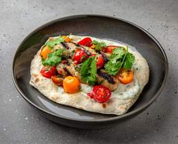 Lulia de pui și miel servită pe focaccia cu sos Tzaziki, roșii cherry și coriandru - 250g