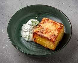 Mâncare din bucătăria franțuzească din cartofi tăiați în felii subțiri, copți în smântână de gătit și asezonați generos cu brânză Alpinella - 170 g