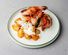 Jumătate de pui la cuptor cu glazură Demi-glace. Servit cu cartofi noi și brânză - 300/150 gr